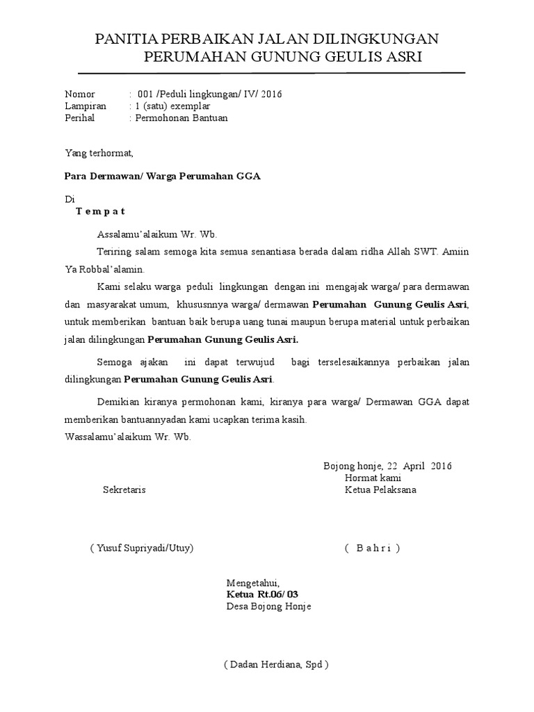Contoh Surat Permohonan Jalan Lingkungan : Proposal Bantuan Pengerasan Jalan Kelompok Tani / Kumpulan contoh surat permohonan untuk kerjasama, rekomendasi, bantuan dana, permohonan maaf, beasiswa atau keperluan yang lain dengan penulisan yang baik dan benar.. Lingkungan karja tidak selalu cocok. Pt sinar x jalan kramat raya 18 jakarta. Surat permohonan merupakan surat yang berisi permohonan atau permintaan secara resmi kepada perusahaan, badan instansi, ataupun seseorang. Kepala desa / lurah untuk penggunaan jalan desa atau lingkungan. Surat permohonan sendiri dapat bersifat resmi atau pun tidak resmi.